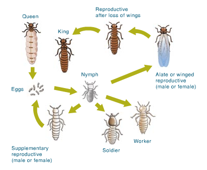 reproductives ประถมเป็น swarmers (alates) ที่จะมีชีวิตรอดประสบความสำเร็จในอันตรายจากการแพร่กระจายหรือเที่ยวบิน "สมรส" และตัดสินลงเพื่อวางและพยาบาลครอกแรก